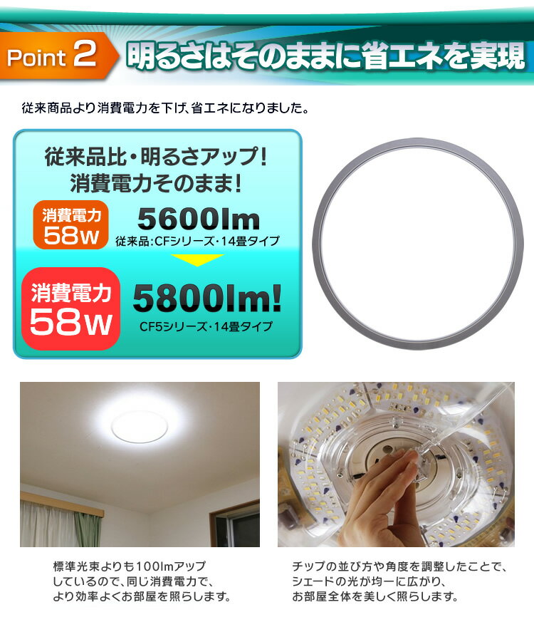 ●適応畳数〜14畳用●定格電圧100V(50/60Hz)●定格消費電力約50W●待機電力0.5W●光色昼光色相当●器具光束5800lm●演色性80Ra●設計寿命40000時間●調光・常夜灯10/2段階●タイマーおやすみタイマ・るすばん機能・点灯タイマー●セット内容LEDシーリングライト本体、取り付け用スペーサー(角)、取り付け用スペーサー(丸)、リモコン、リモコンホルダー、単3形乾電池×2本、ネジ×2本、取扱説明書●材質ポリプロピレン、鋼板、難燃ポリカ●商品サイズ(cm)直径約56×高さ約9.3●重量約1.8kg